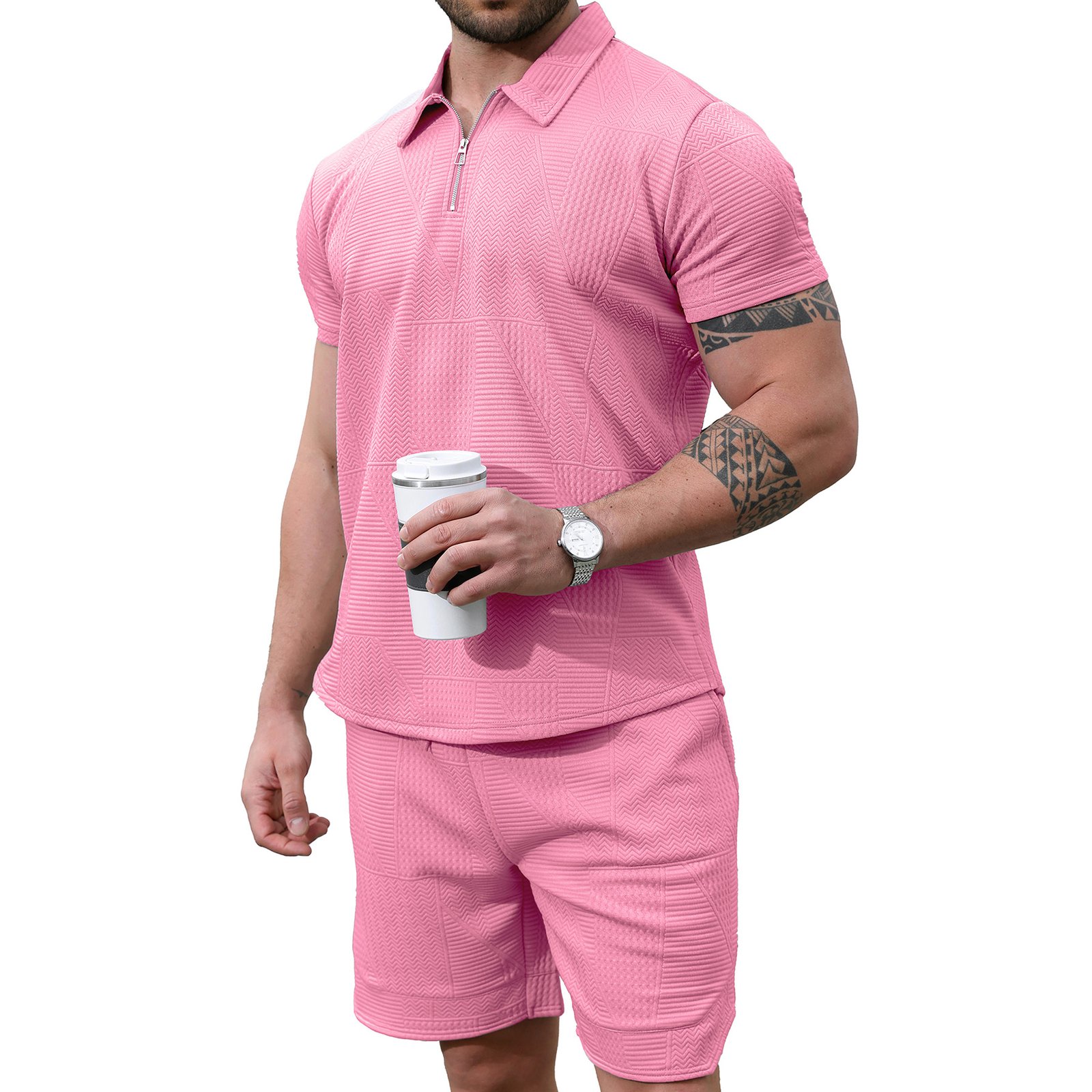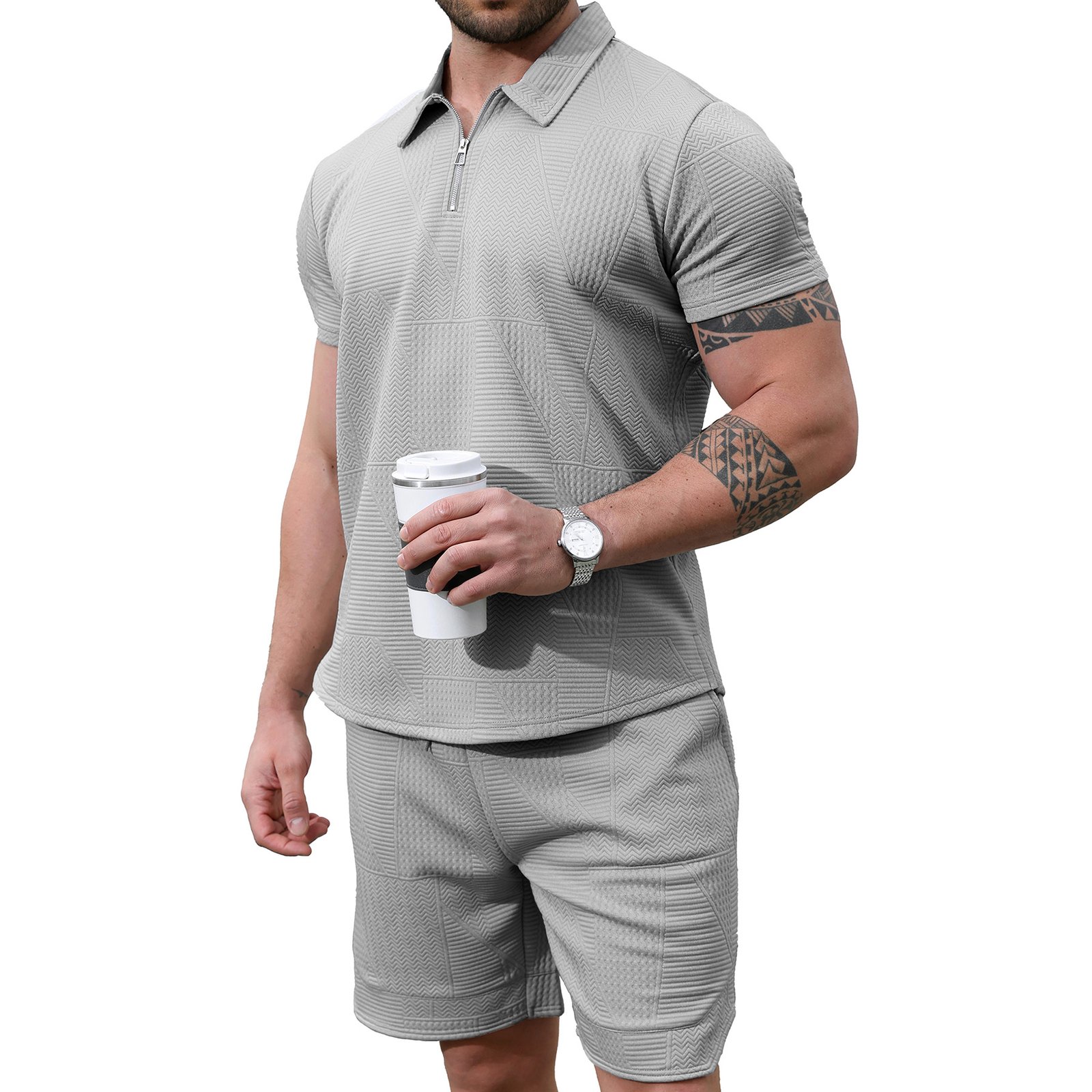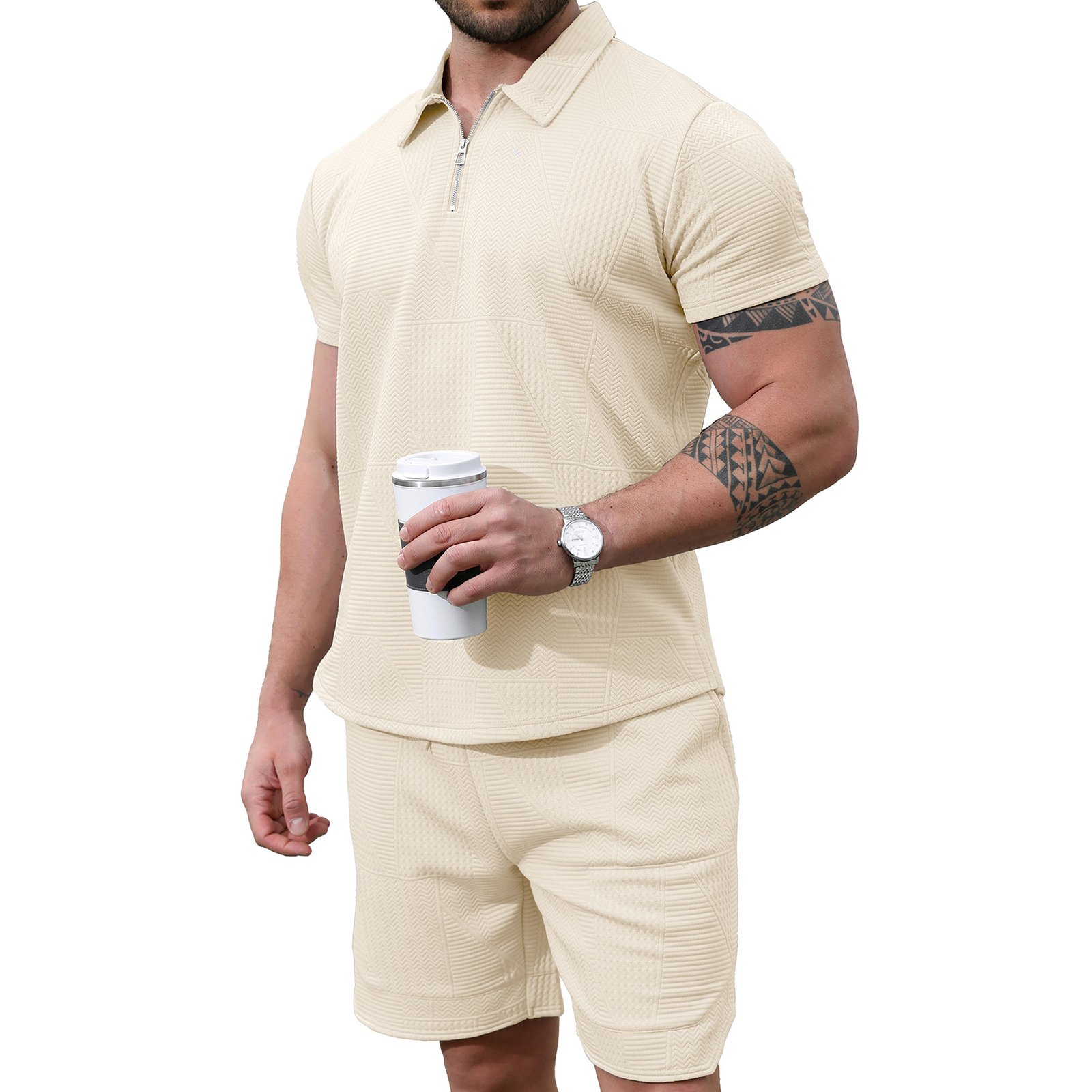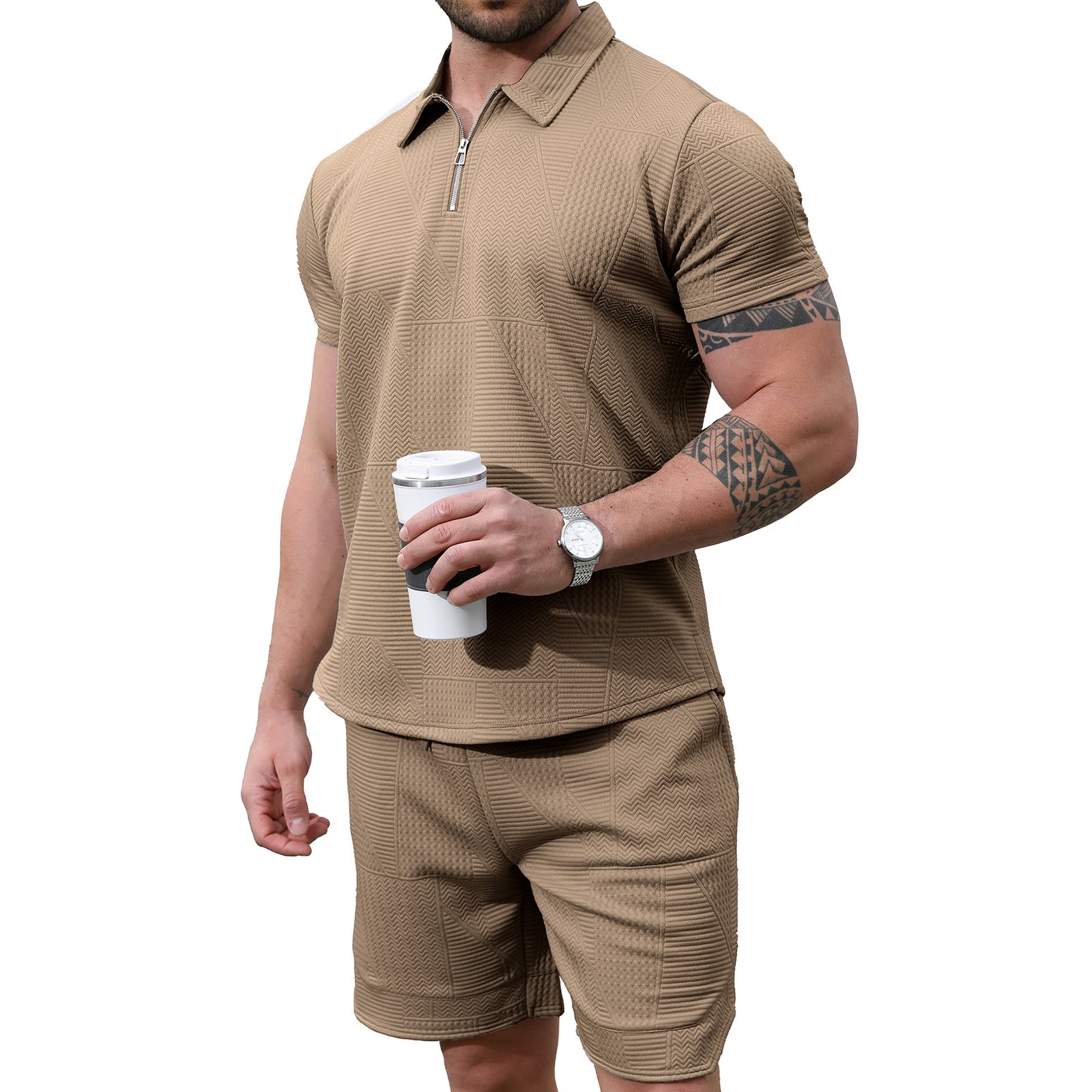 Men's 2 Piece Short Sets Outfits Summer Polo Shirts and Shorts Casual Zip Short Sleeve